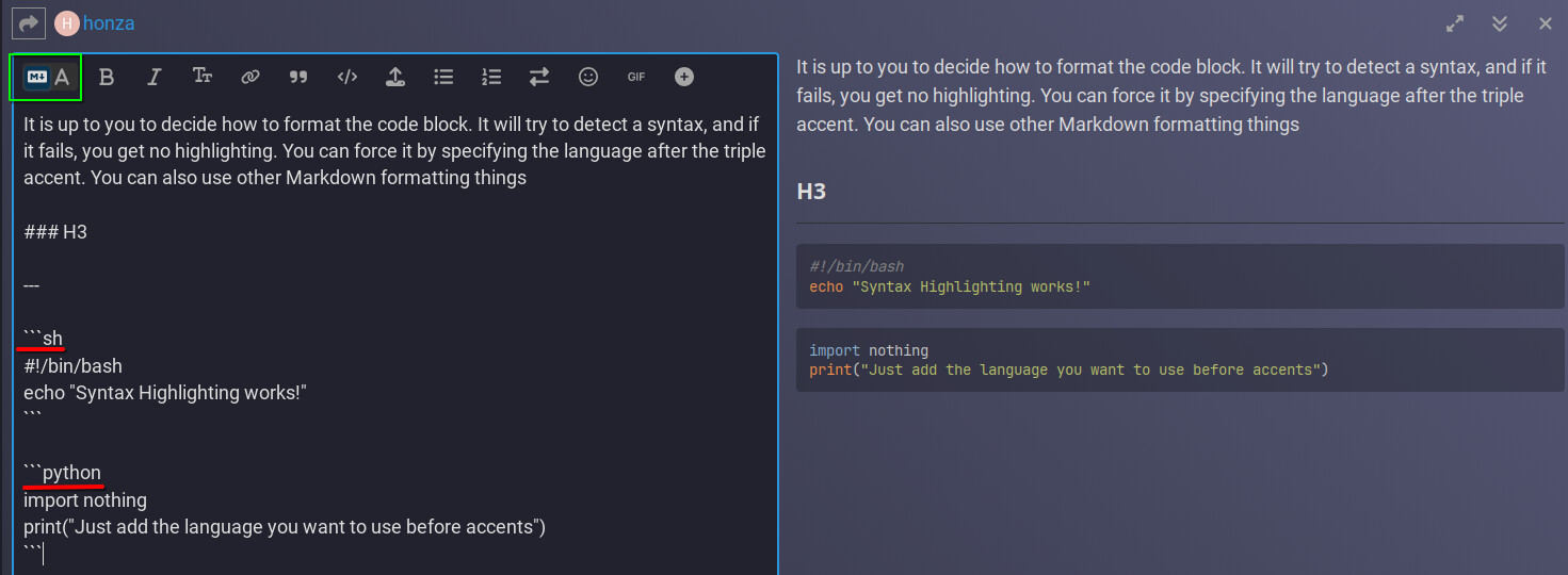 It is up to you to decide how to format the code block. It will try to detect a syntax, and if it fails, you get no highlighting. You can force it by specifying the language after the triple accent. You can also use other Markdown formatting things
