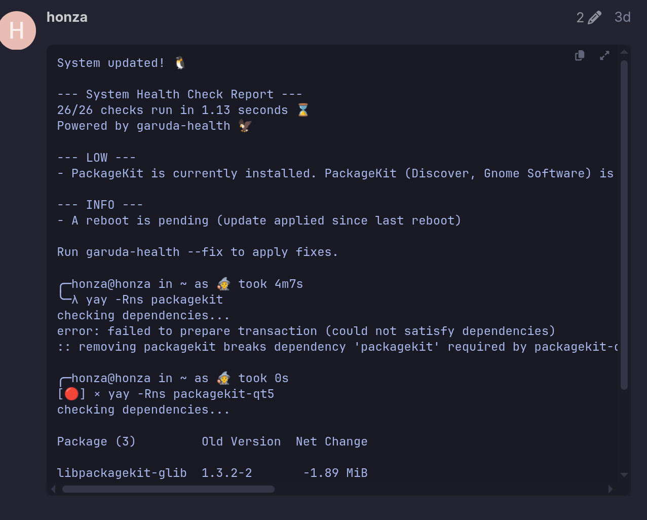- PackageKit is currently installed. PackageKit (Discover, GNOME Software) is not a supported method to manage packages on Garuda Linux. https://wiki.garudalinux.org/avoid-packagekit (fix available)