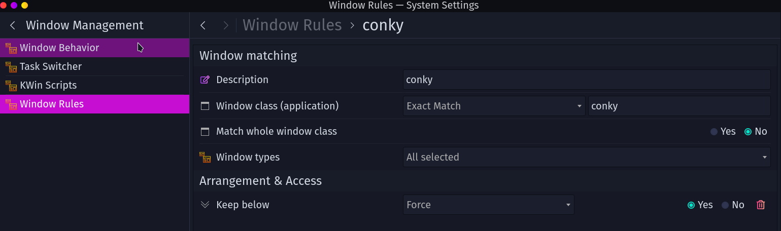Here is the window rule, I used the built in window rules from system settings in KDE.