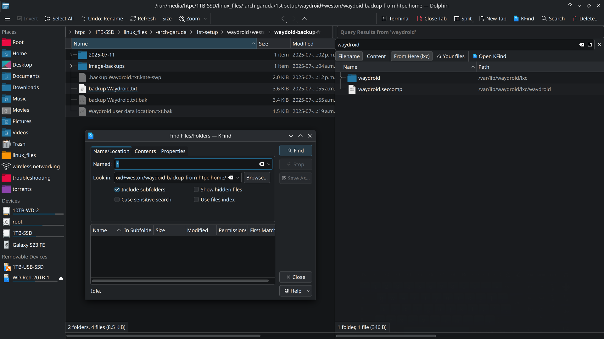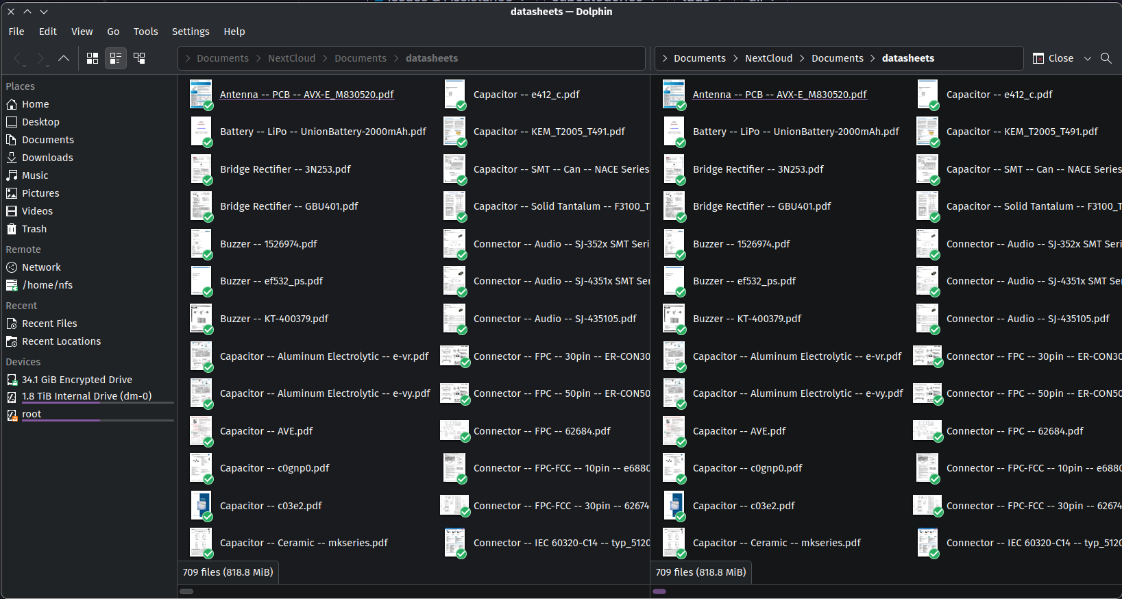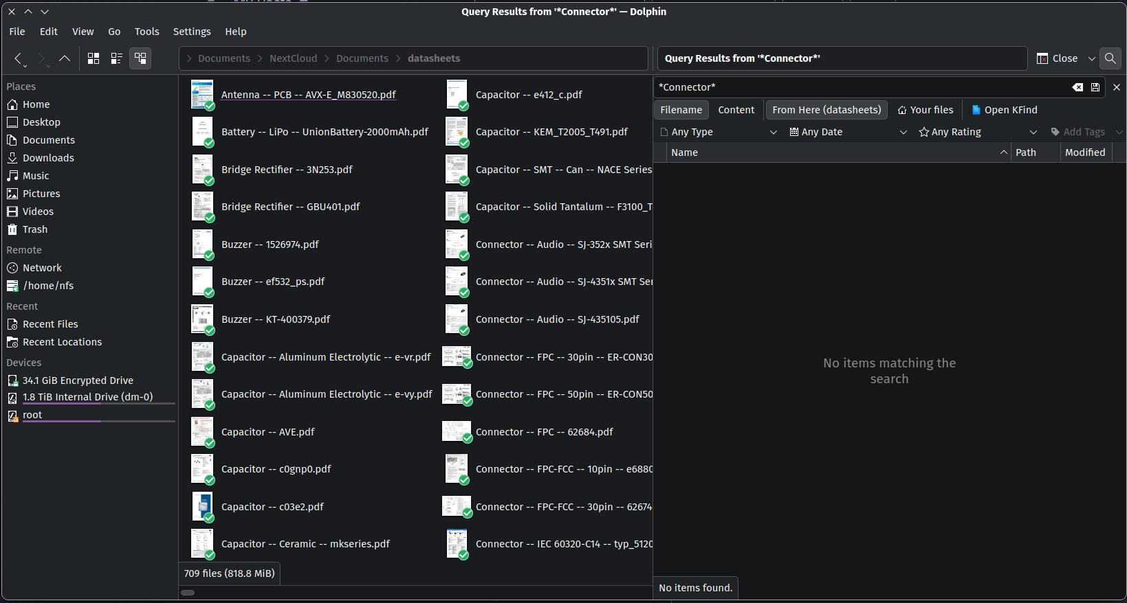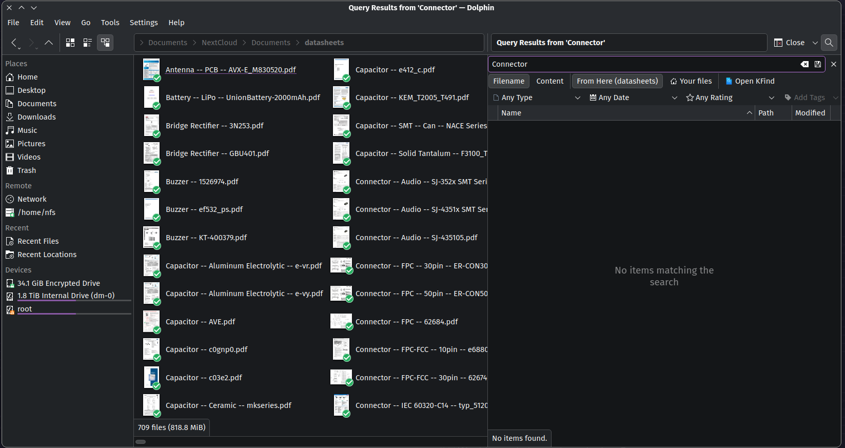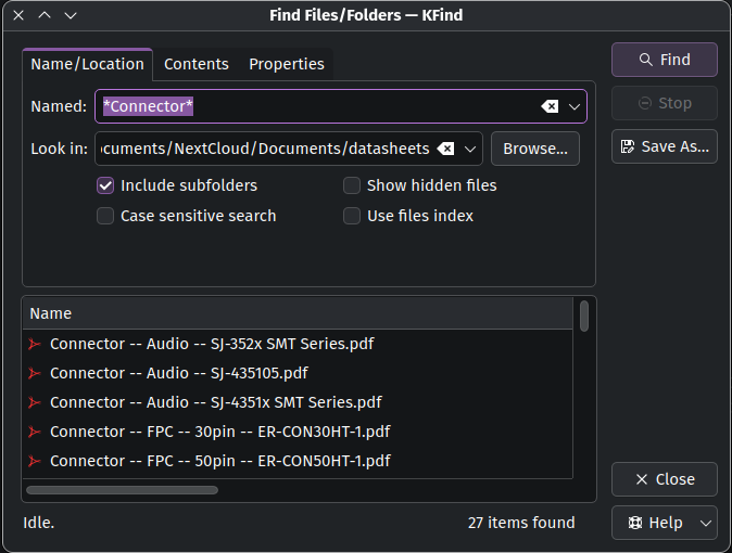 When entering any search string, the result is always “No items matching the search”. I know that it is frowned upon when proof is submitted in form of screenshots, but it suits the case best so here it goes. The first screenshot shows the actual contents of the directory, and you can see the file names starting with “Connector …”. The second screenshot shows the results of the search for “Connector”. I would have expected the file list to be reduced to all files that contain “connector” in the name, not to nothing. When searching the same folder with KFind, the search works as expected and I get a proper list of files.