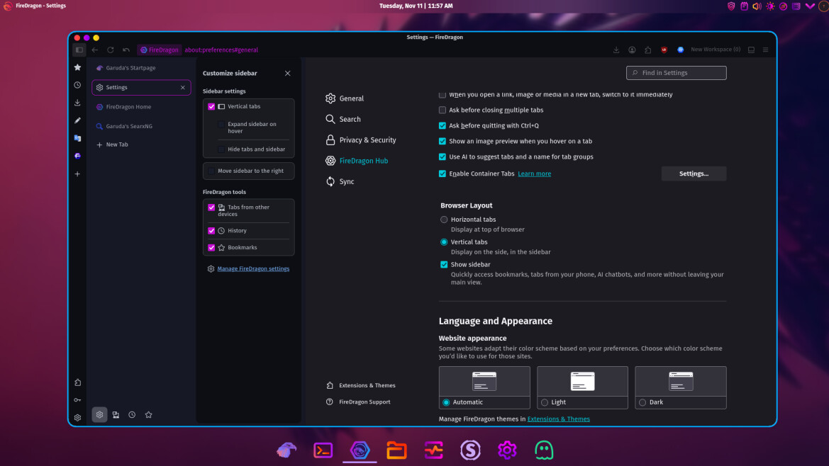 Here’s the issue, when using firedragon w/vertical tabs, on one single window, it works kind of good (except resizing, which doesn’t work that well seeing as it has a strict minimum width from what I’ve seen). when dragging a tab outside the main window, it creates a new firedragon window, with only that tab. it’s only a UI issue, as using ctrl+tab still allows me to cycle through tabs in that window, however creating new tabs doesn’t show them, neither the first one is.