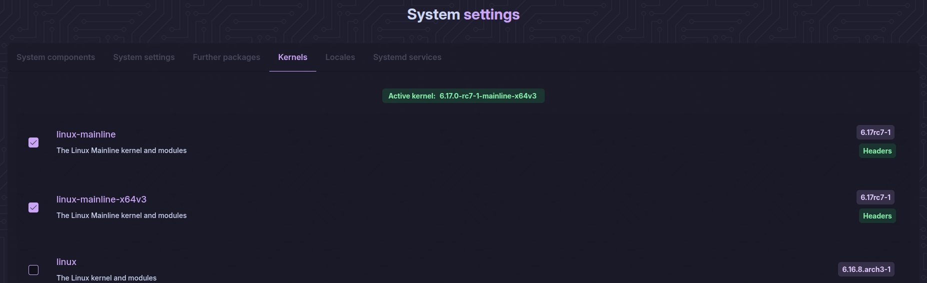 As I mentioned in my previous post (the longer one) I had the kernel “linux (6.16.5.arch1-1)” and the cachyos (6.17.0-rc-2-cachyos-rc) installed.