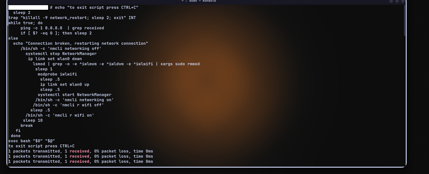 - Confirmed: LTS kernel detected, Wi-Fi interface exists, iwd running, power saving and AX mode disabled
