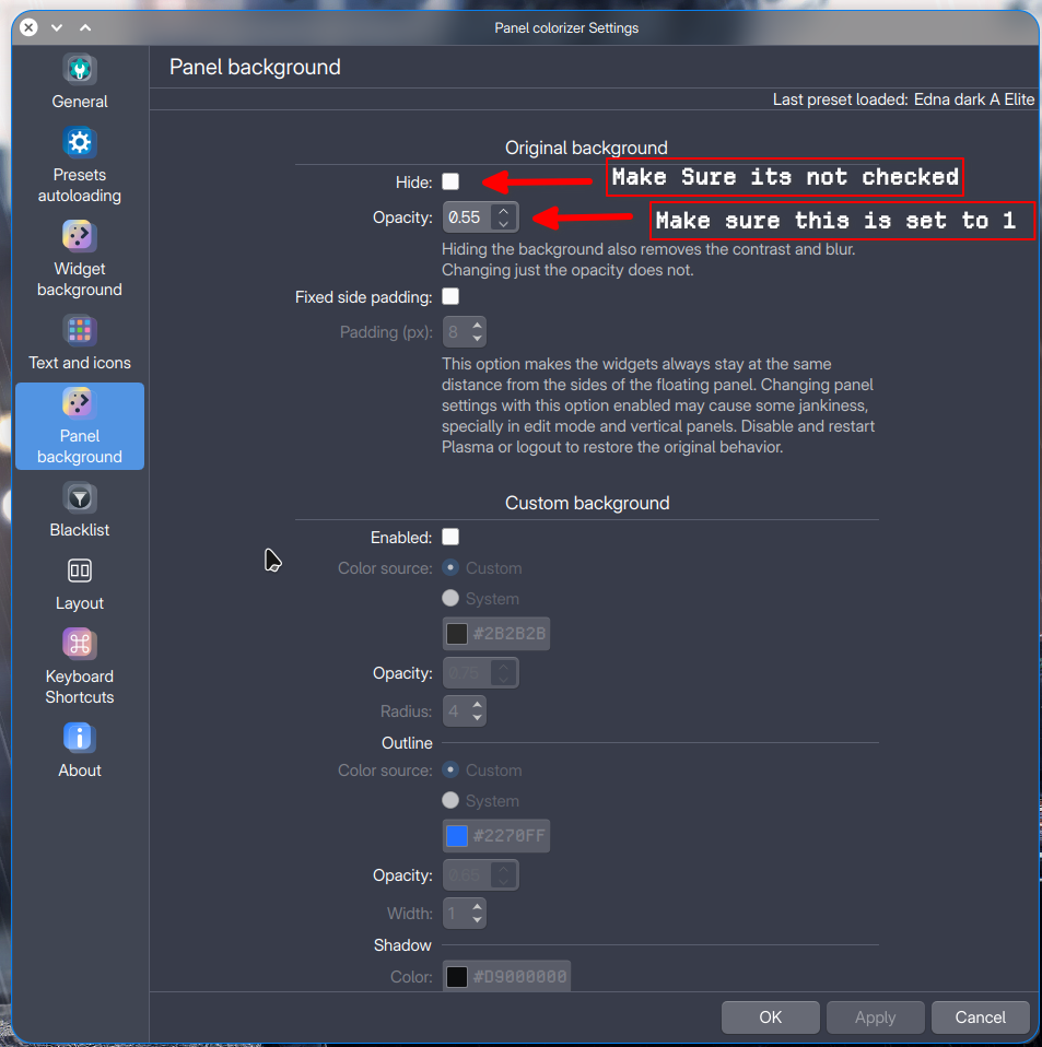 Configure Panel Colorizer. I’ve loaded the Garuda Dock preset and under Appearance I toggled both Background and towards the bottom the Enable for Background and fiddled with those settings, too.