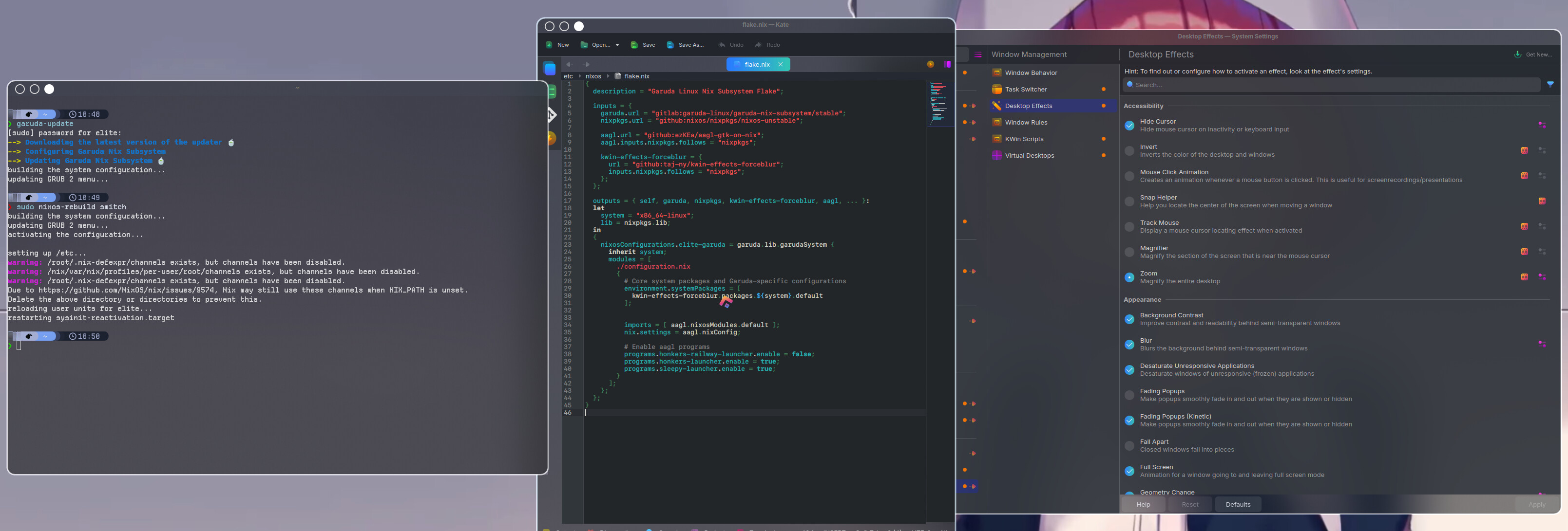 I had kwin-force-blur flake working just fine. The moment I added something else to the config an rebuilt all was fine the blur still worked. But before bed like always ran garuda-update an shut down. Power on in the morning an the blur effect is gone. Changing the flake back to normal rebuilding an all that, nothing works. You can temporary restore it if you use the vary early generations on boot with the the “Nix All configurations” an picking a old one but after a reboot its gone again.