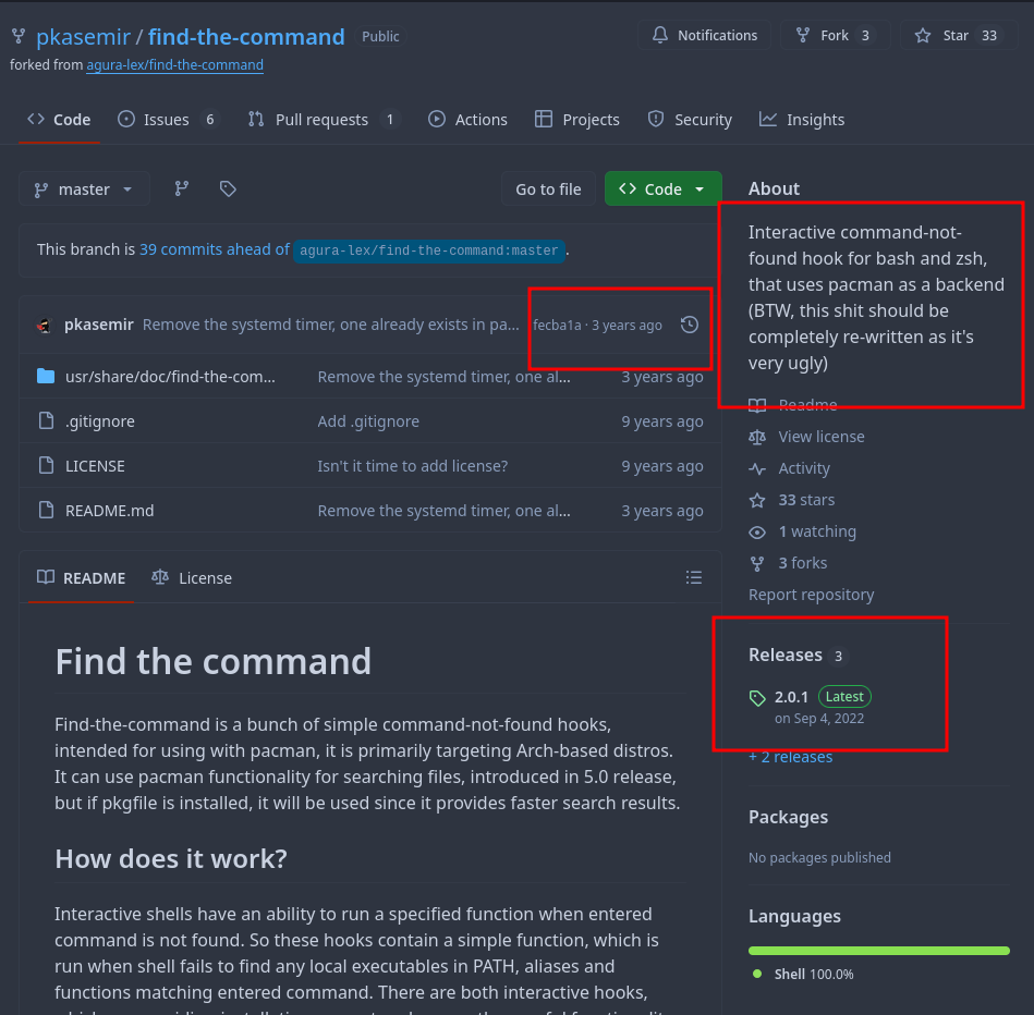 It looks like it hasn’t seen a commit in three years, despite self-identifying as an “ugly” script which “should be completely re-written”. GitHub - pkasemir/find-the-command: Interactive command-not-found hook for bash and zsh, that uses pacman as a backend (BTW, this shit should be completely re-written as it's very ugly)
