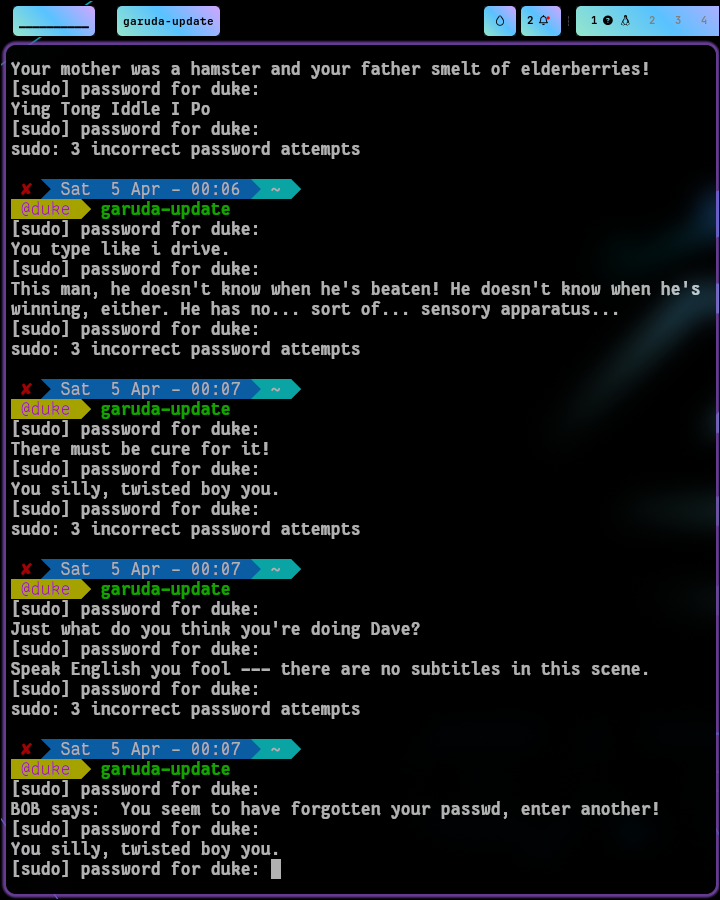 Did i broke the Terminal on the Session with messing with the Terminal, also no other Terminal was working with my password. I did a reboot and its worked again