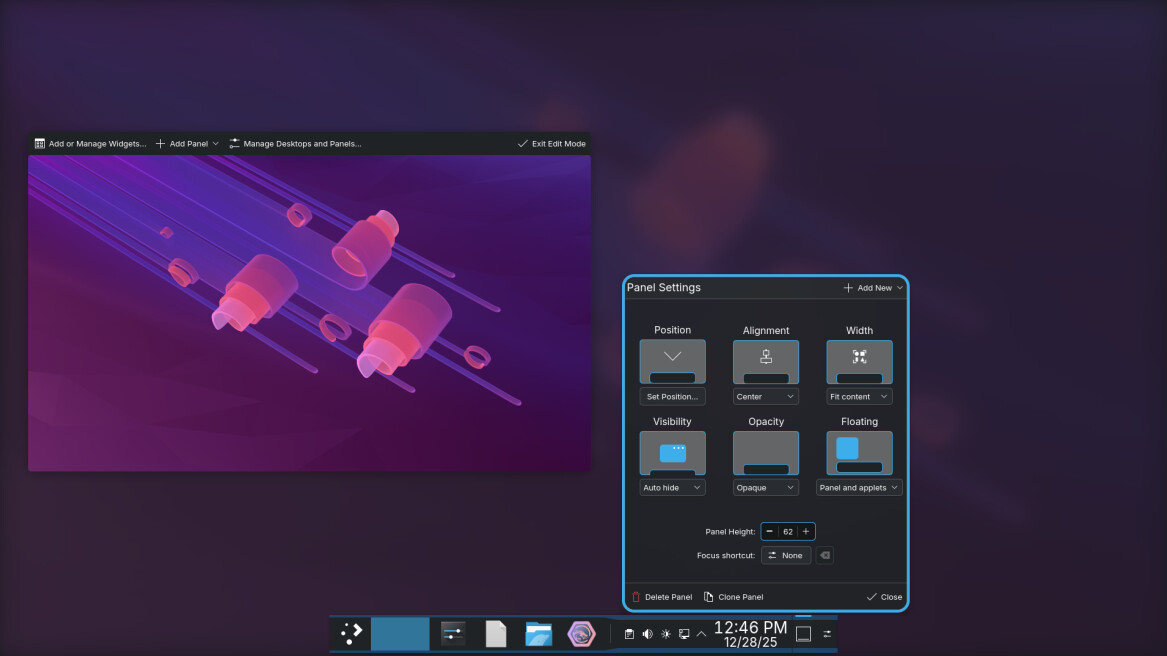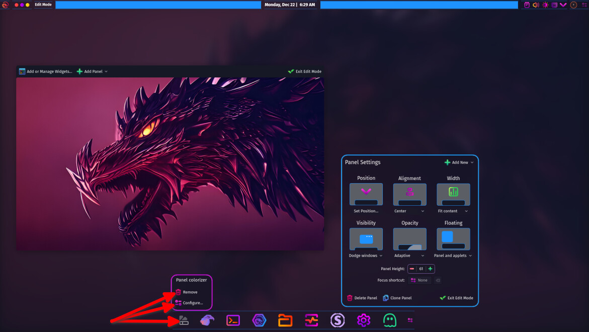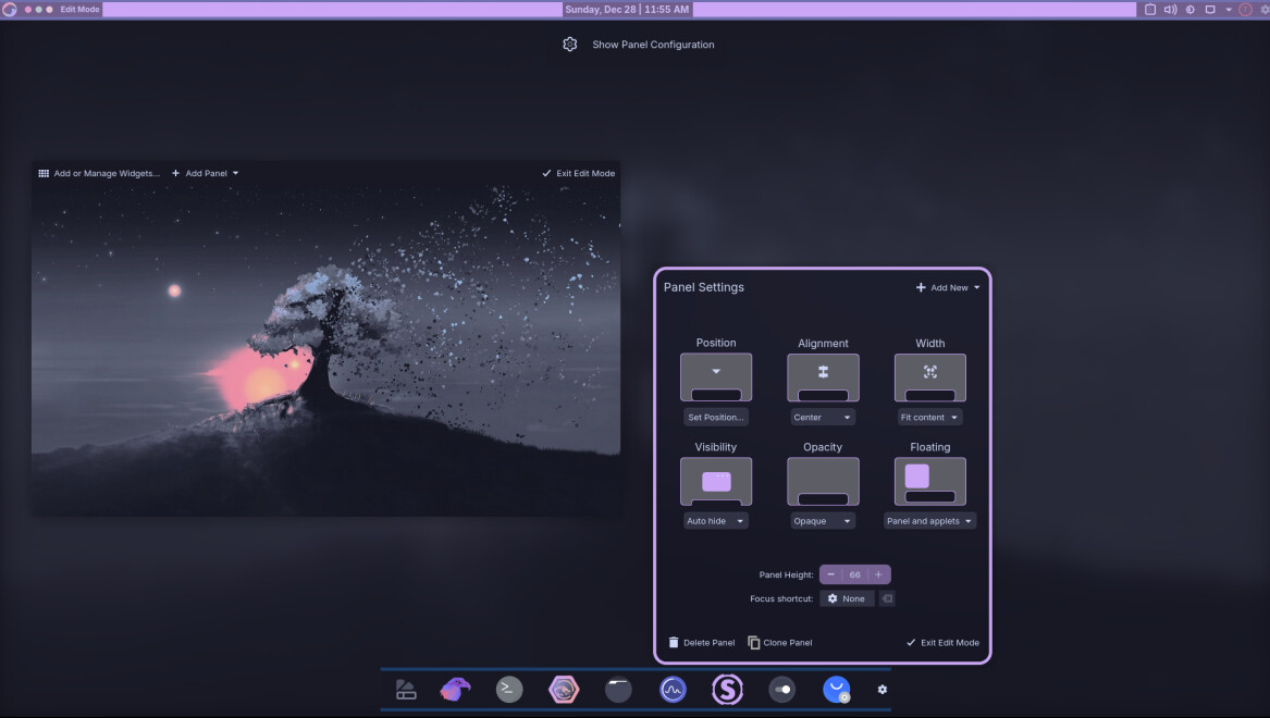 Right-click on the desktop → Enter Edit Mode and set the panel settings as follows, for example: