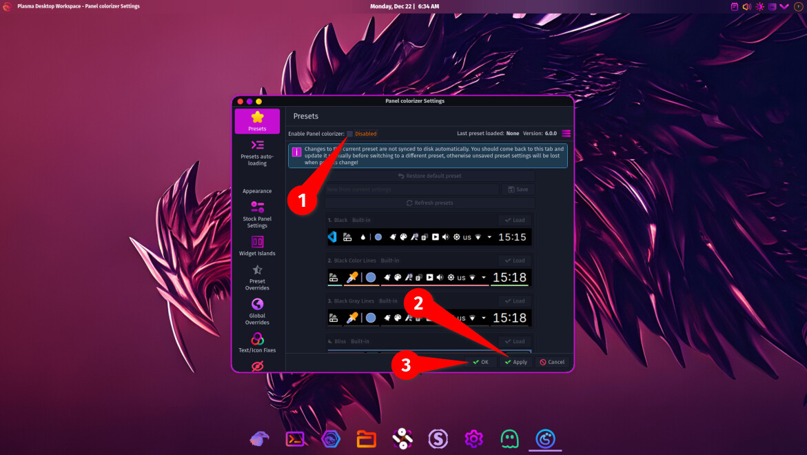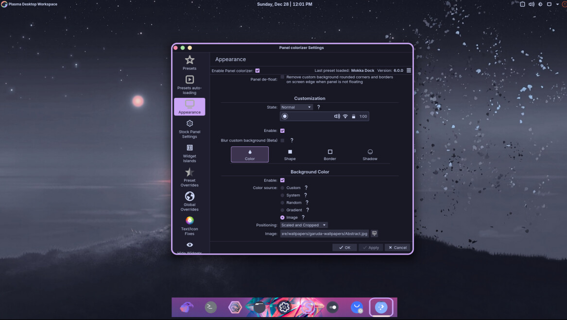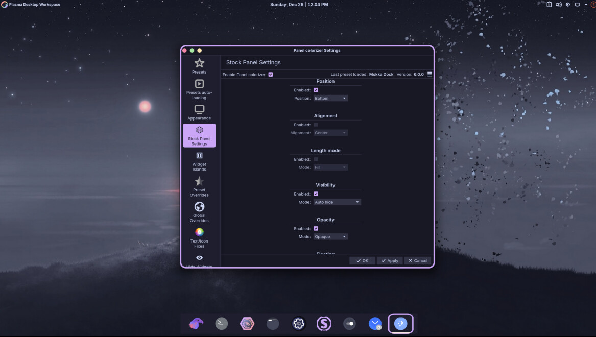 I have already described the procedure for the default Breeze bottom panel above. If you are using the Garuda dock instead of the Breeze panel, disable the “Panel Colorizer” in the bottom dock (or remove the widget from the bottom dock, as the Panel Colorizer overwrites the KDE settings) and set “Opacity” to “Opaque” in the Panel Settings (and “Visibility” to “Auto hide” if you want the dock to only be displayed when you hover over it):