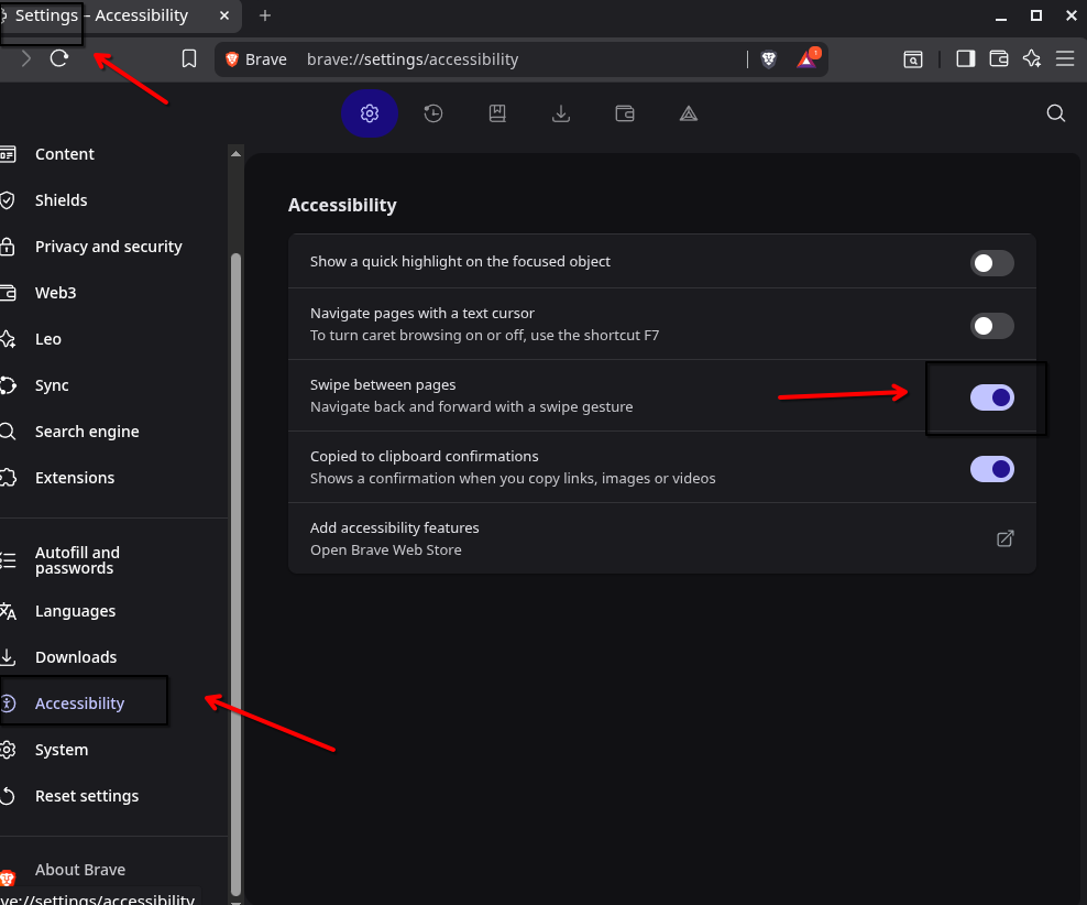 when i do three finger swipe up, it is taking me to next desktop, how to resolve that and in brave browser, i cant use two finger swipe left or right to go foreward or backward, i need some help please