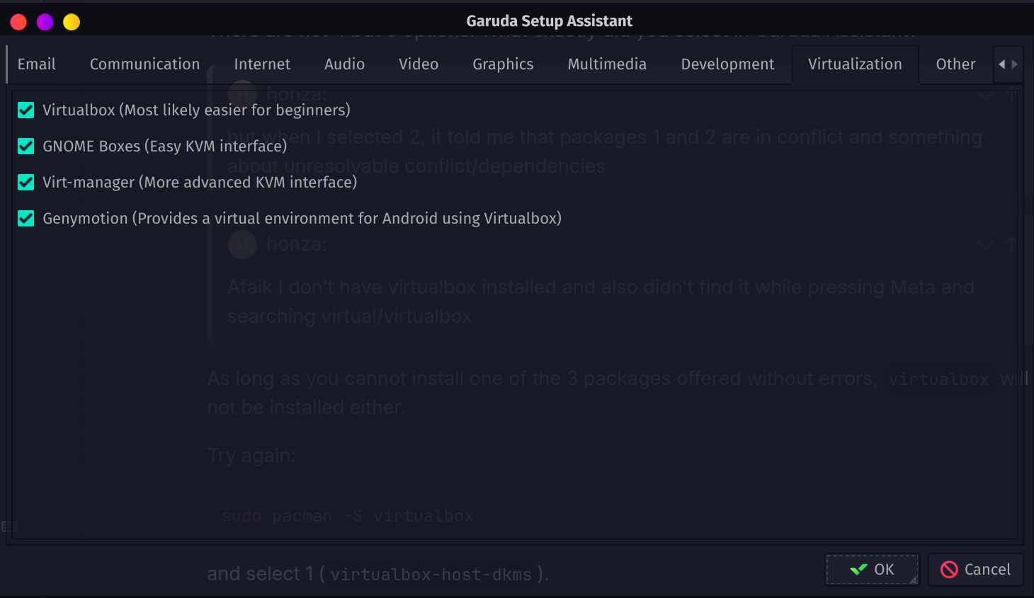 I forgot to copy it, but when I selected 2, it told me that packages 1 and 2 are in conflict and something about unresolvable conflict/dependencies (idk which one). Why? Afaik I don’t have virtualbox installed and also didn’t find it while pressing Meta and searching virtual/virtualbox